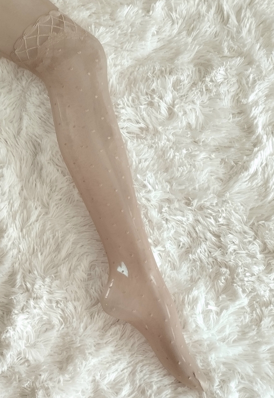 Průhledné 20 denierové punčochové kalhoty (punčocháče, silonky) Veneziana Sophia s puntíkatým vzorem imitující nadkolenky. Punčochové kalhoty mají nezesílený sed, nezesílené špičky, komfortní ploché švy a malý bavlněný klínek.